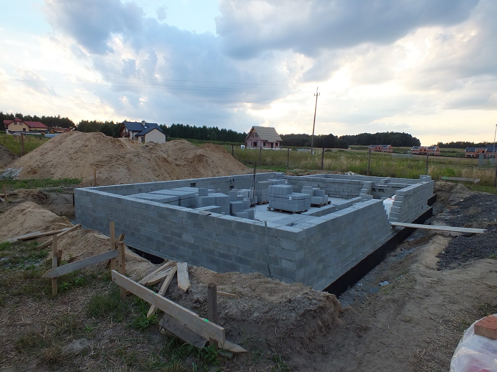 Wczoraj, zgodnie z zapowiedziami pana Zbyszka, ruszyło murowanie ścian fundamentowych. Niestety, nie mogliśmy dokonać "wizytacji" placu budowy i zrobiliśmy to dopiero dzisiaj wieczorem. Muszę przyznać, że ekipa budująca naszego Familiarisa chłodzi się chyba ciekłym azotem, bo w te niesamowicie skwarne dni wykonali spory kawał dobrej roboty. SZACUN dla wszystkich, którzy muszą w ekstremalnych warunkach pogodowych gorącego lata i mroźnej zimy wykonywać swoją pracę na zewnątrz.