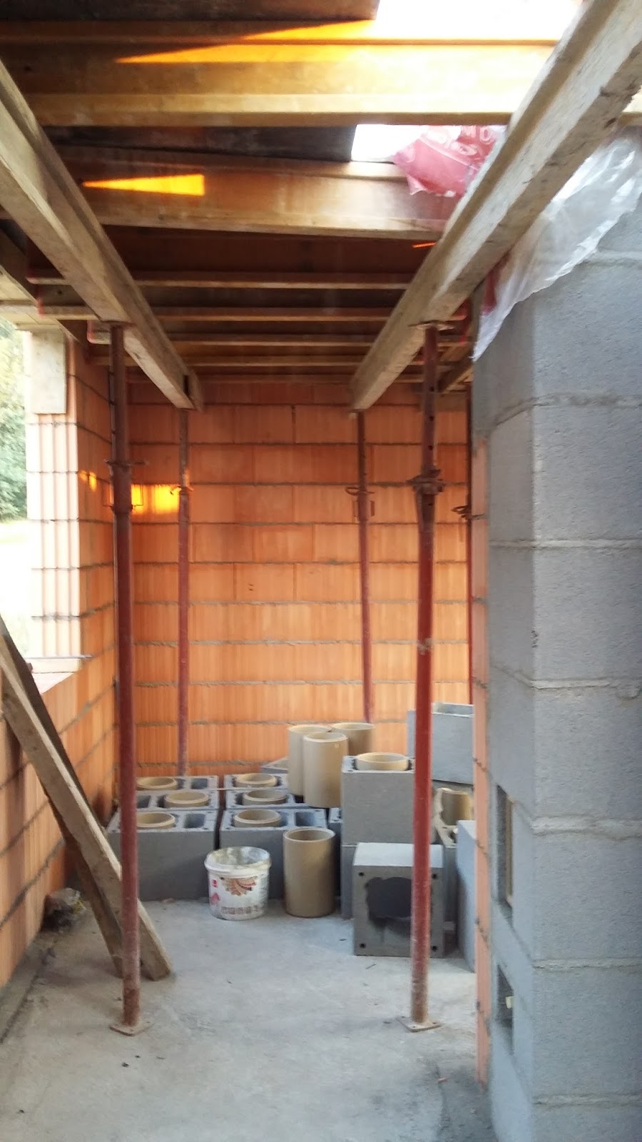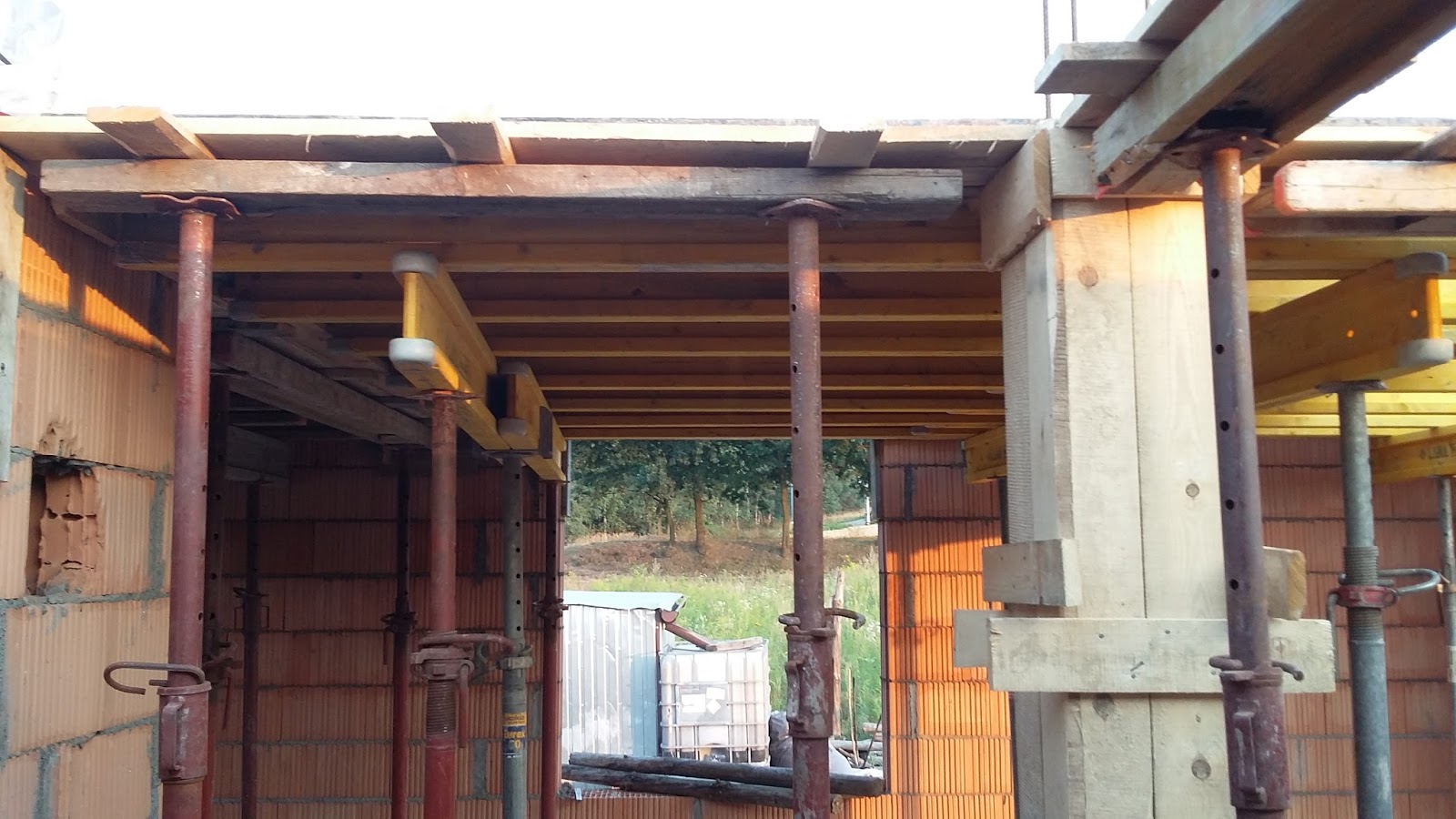Ho, ho, ho, wchodzę między mury i nie widzę nieba! Większa część powierzchni parteru została przykryta deskowaniem stropu. Chłodniej od tego nie będzie, ale panowie budowlańcy pracując w te piekielnie gorące dni nad zbrojeniem stropu, mogą choć na chwilę schować się w cieniu deskowania, które sami zrobili.