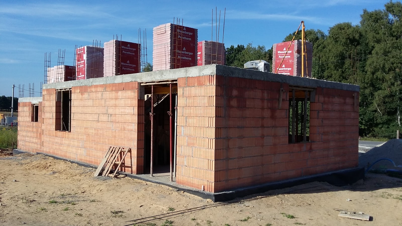 W drodze powrotnej zahaczyliśmy o działkę celem polania wodą zabetonowanych wczoraj stropu i schodów. Już z dość daleka widać, że na stropie poukładane są palety z pustakami, a po wejściu na budowę zauważamy nową kupę piasku, paletę z cementem i kilka palet pustaków grubości 11,5 cm na ścianki działowe. Ze stropu i schodów zniknęły te elementy deskowania, które można było zdemontować i ogólnie widać, że panowie z grubsza uporządkowali wnętrze, choć na brak porządku na budowie na prawdę nie mogę narzekać.