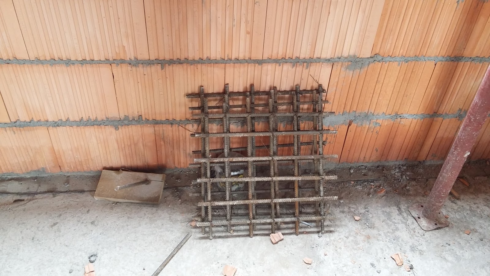 | Fachowcy przygotowali sobie zbrojenie na stopy fundamentowe trzech kolumn zewnętrznych. |