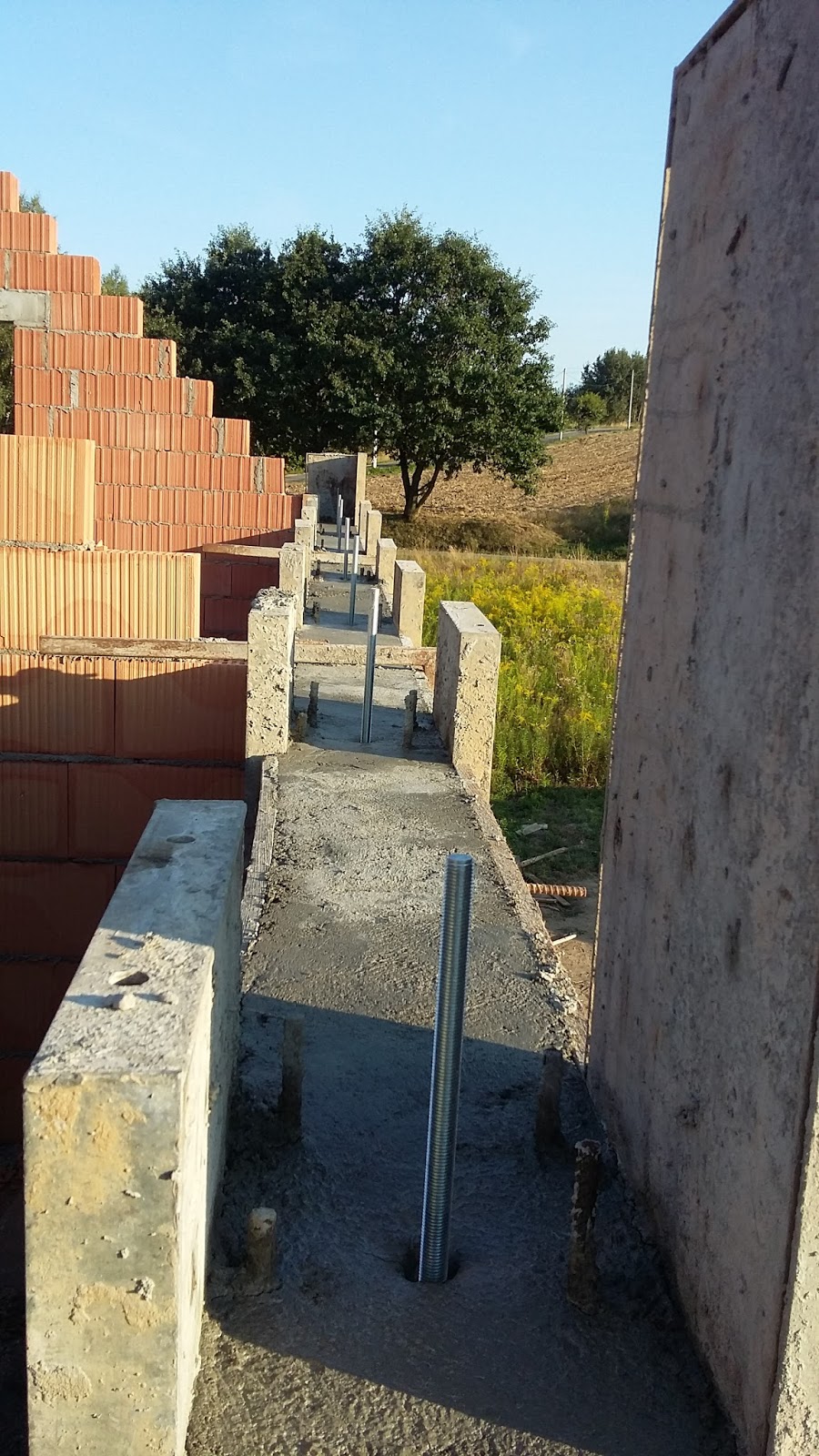 Stało się dokładnie tak jak przypuszczałem - na budowie jest pełno śladów pozostałych po wizycie betoniarki. Zalane betonem zostały słupki w ściankach kolankowych w ilości sztuk 24, na całej długości ścianek kolankowych wylano odrobinę betonu jako warstwę wyrównawczą pod murłatę oraz zabetonowano przygotowane wczoraj trzy stopy fundamentowe pod zewnętrzne słupy.