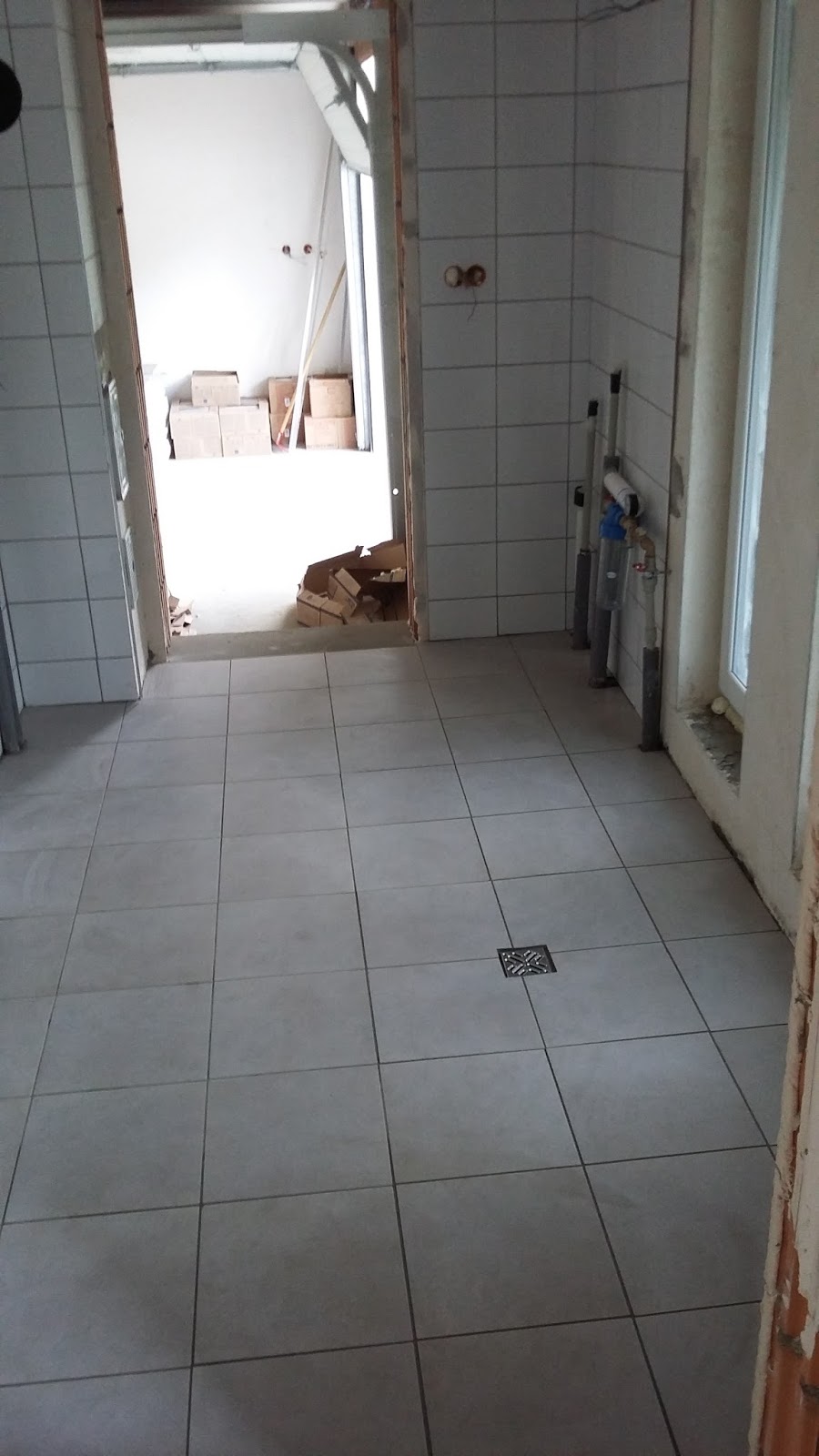 Wczoraj wieczorem położyłem ostatnie cztery kafle na podłodze tuż przy wpuście podłogowym. Dzisiaj natomiast zafugowałem całość ścian i podłogę.