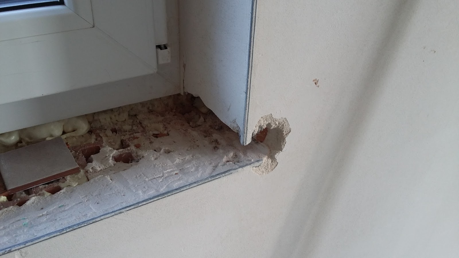 Zająłem się też jednym z dwóch parapetów wewnętrznych. Z obu stron wnęki okiennej w salonie podkułem tynk, żeby parapet mógł swobodnie wsunąć się na swoje miejsce i zaklinować się po bokach w murze, ale zanim to nastąpi uzupełniłem pianą montażową puste przestrzenie pod ramą okienną. Może jutro, po stwardnieniu piany, będę kontynuował montaż parapetu.