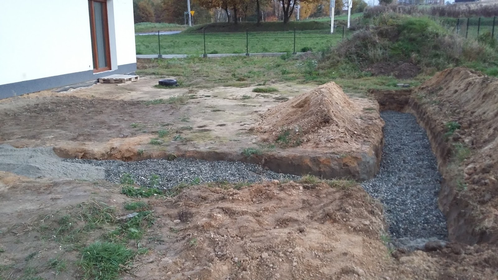 Co się dzieje przy domu? Trzy z pięciu rynien zostały połączone z rurą drenarską, która z kolei została owinięta geowłókniną, ułożona w warstwie żwiru i zasypana. Teraz czekamy na chrzest bojowy w postaci solidnych opadów deszczu, które zweryfikują naszą ciężką robotę na dwie łopaty i taczkę.