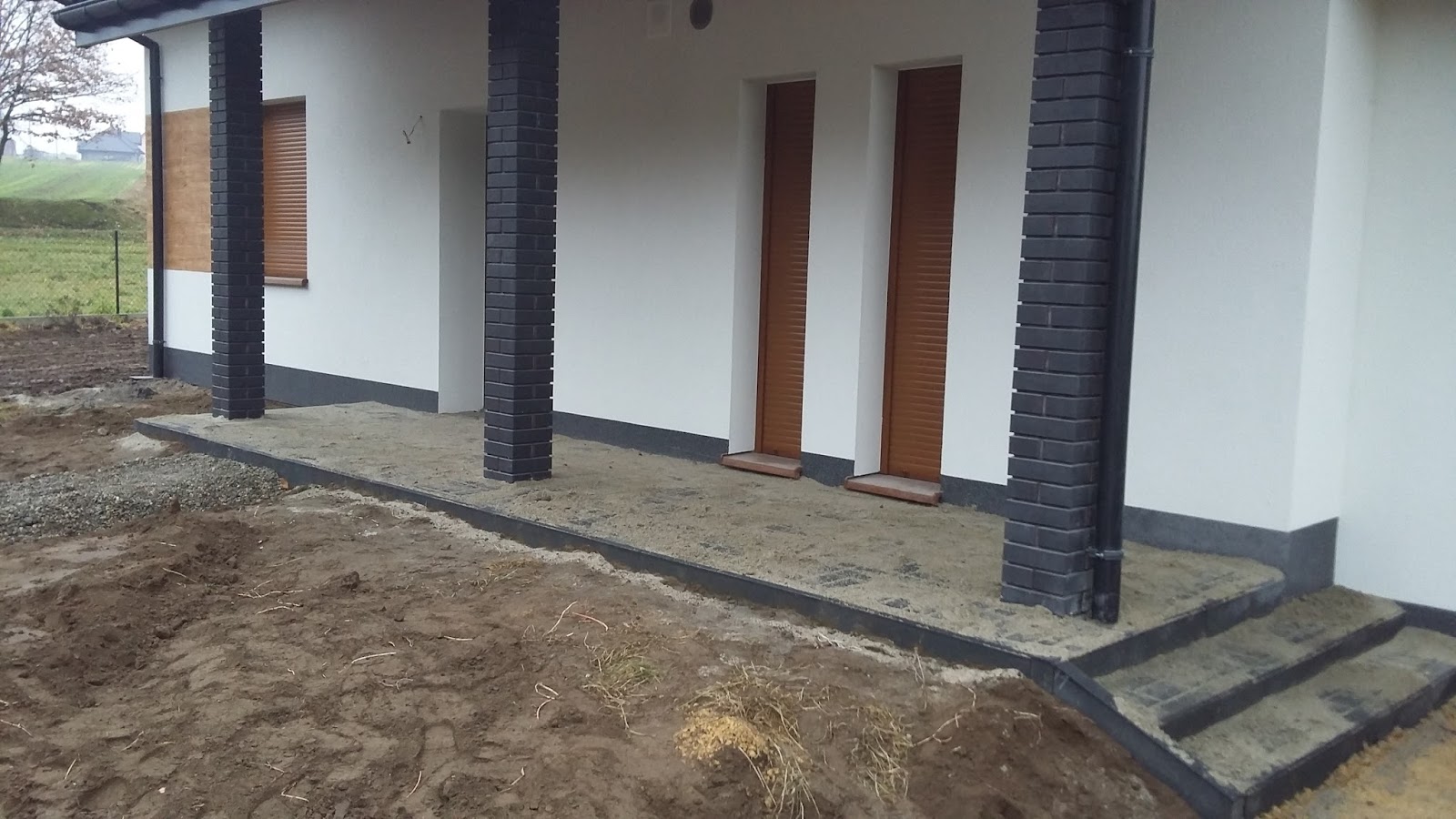 Brukarze skończyli robotę. Mamy zrobiony z kostki betonowej zjazd z drogi, taras i całe wejście do budynku, a także utwardzony plac przed garażem i ścieżkę do drzwi wejściowych. Ponieważ budynek z zewnątrz jest gotowy i zrobione są wszystkie przyłącza (woda, kanalizacja i prąd) to mogę wyskrobać z dna skarbonki "tysiaka" i zatrudnić geodetę do zrobienia inwentaryzacji końcowej.