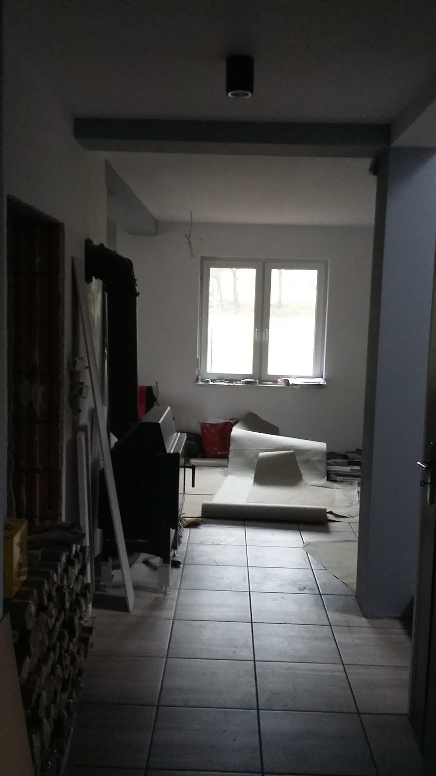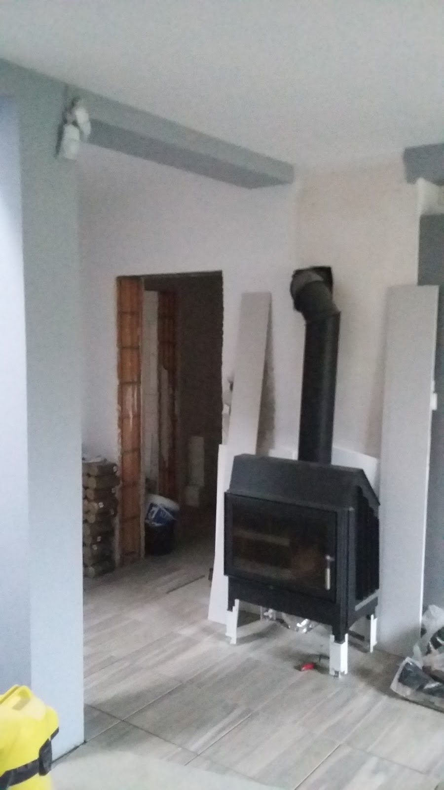 Zostałem poproszony o kilka zdjęć kominka, aby pokazać ilość miejsca jaka zostaje w przejściu między nim a innymi elementami budynku. Odległość między nieobudowanym wkładem kominkowym a słupem przy schodach wynosi dokładnie 106 cm, i nie sprawia nam kłopotów, nie jest jakaś niewygodna. Wiadomo, w wielkich salonach te odległości są zupełnie inne, ale wydaje się, że w naszym przypadku jest też całkiem dobrze.