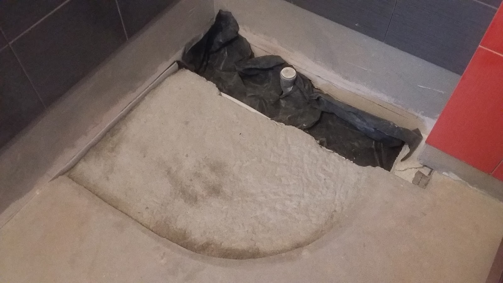 Jedyne co przyszło mi do głowy to nie tyle skuć co zdłutować wylewkę na głębokość 3-4 cm, uważając oczywiście na pracującą w tym miejscu podłogówkę. Tak więc przy pomocy szlifierki kątowej zaopatrzonej w tarczę do cięcia betonu, multinarzędzia z odpowiednią końcówką, młotka i płaskiego śrubokręta pracującego tu jako dłuto, zdjąłem wierzchnią warstwę wylewki na powierzchni, którą będzie zajmowała kabina prysznicowa.