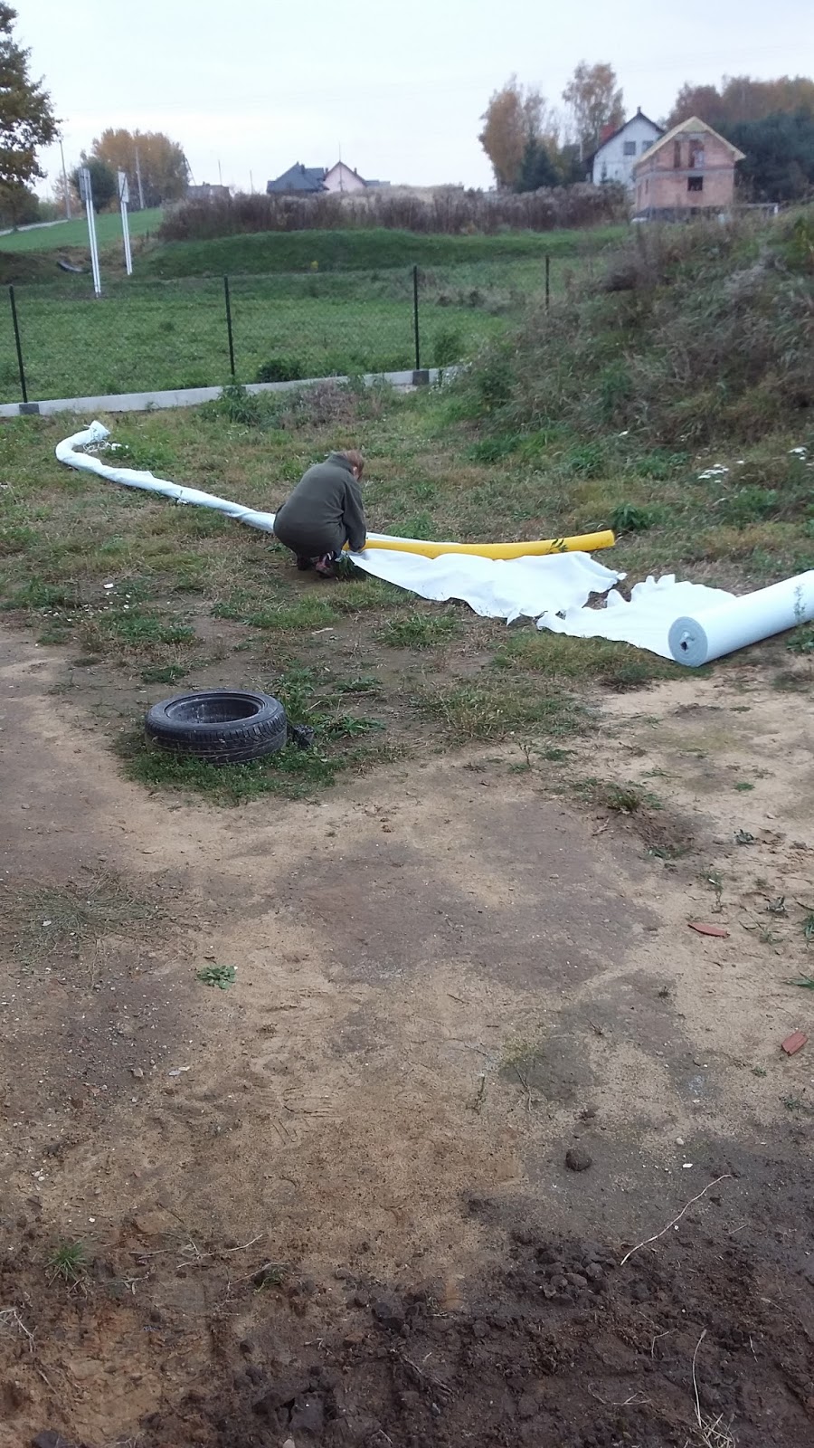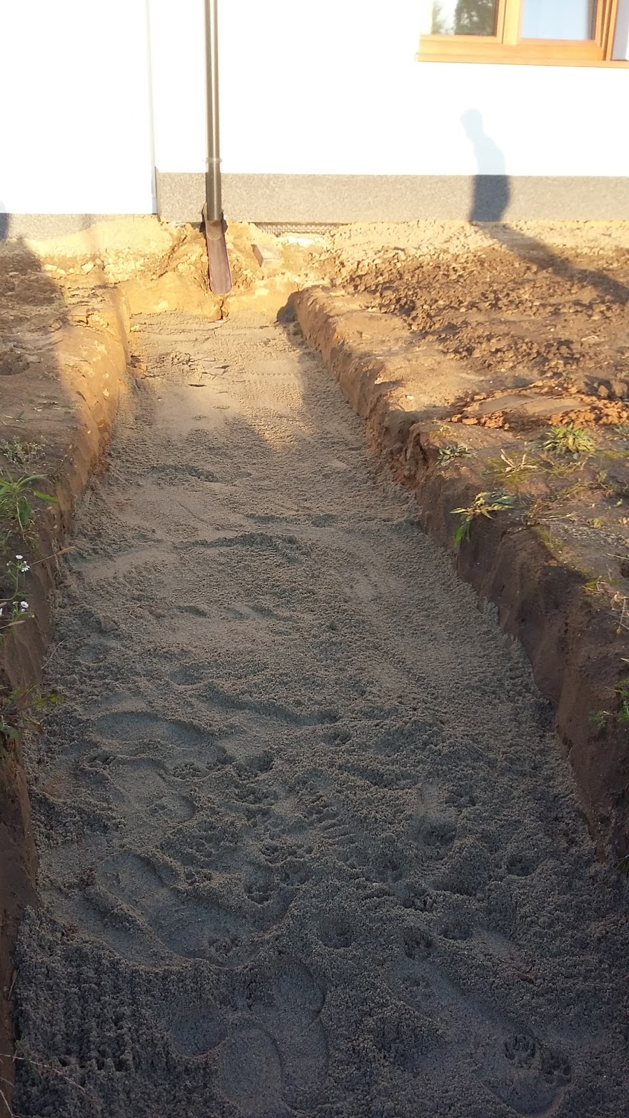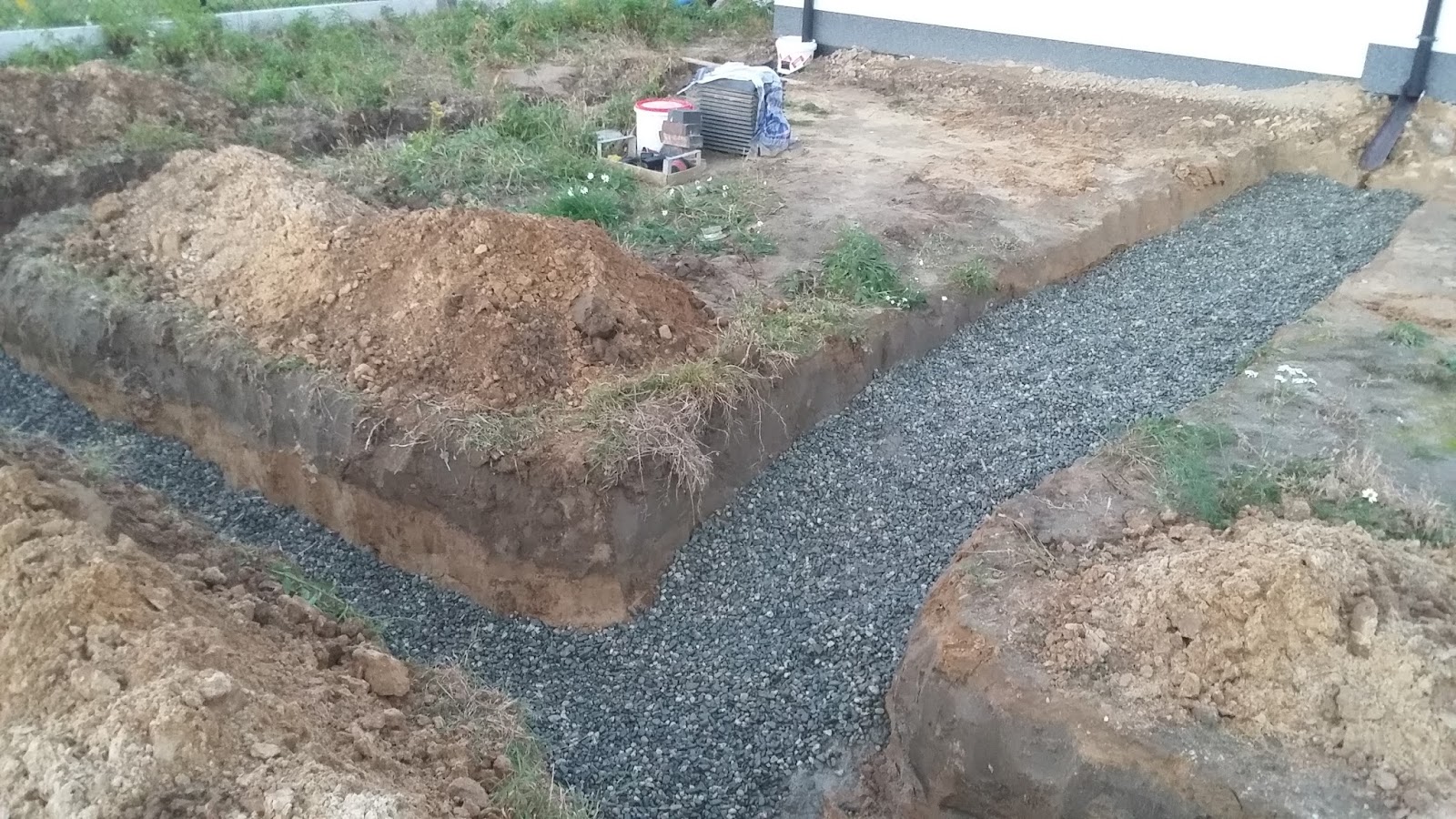 Na zewnątrz wraz z żoneczką kontynuowaliśmy prace przy odprowadzeniu wody z rynien. Dzisiaj niemal skończyliśmy pierwszą z pięciu, niemal, bo wieczór nadszedł jakoś tak momentalnie, a oświetlenia na zewnątrz jeszcze nie mamy. Do przygotowanego wcześniej wykopu włożyliśmy zestaw składający się z rury drenażowej perforowanej (kilkanaście metrów) połączonej z rynną przez buta z koszyczkiem (w którym będą zatrzymywać się większe nieczystości spływające z rynny np. liście), kolanko elastyczne i dwumetrowy odcinek rury drenażowej bez otworów (po to, aby oddalić rozsączanie wody deszczowej od fundamentów. Perforowana rura drenarska została owinięta w geowłókninę tak, aby nie zamulały się drobne otwory na jej powierzchni służące do odprowadzania deszczówki, a następnie całość ułożyliśmy na dnie wykopu. Wszystko to zostało przysypane żwirem, potem piaskiem, a następnie ziemią uzyskaną z robienia wykopów.