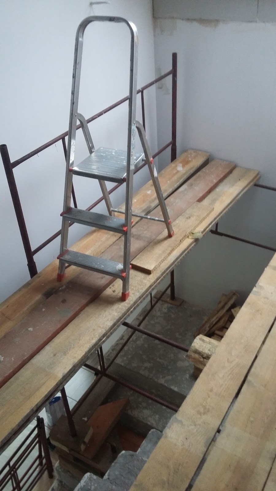 Zapomniałem już, ile miejsca mamy na schodach. No nie ma tego jakoś rewelacyjnie dużo, ale przez ostatnie dni widok był znacznie zawężony przez rozstawione rusztowanie. Po zainstalowaniu na ścianie kinkietów rozebrałem konstrukcję małpiego gaju, który dawał mi "rozrywkę" przez ostatnie dni. Zrobiło się jasno i przestronnie, kinkiety nadają temu miejscu elegancji a ja z efektów mojej pracy czuję się zwyczajnie dumny.