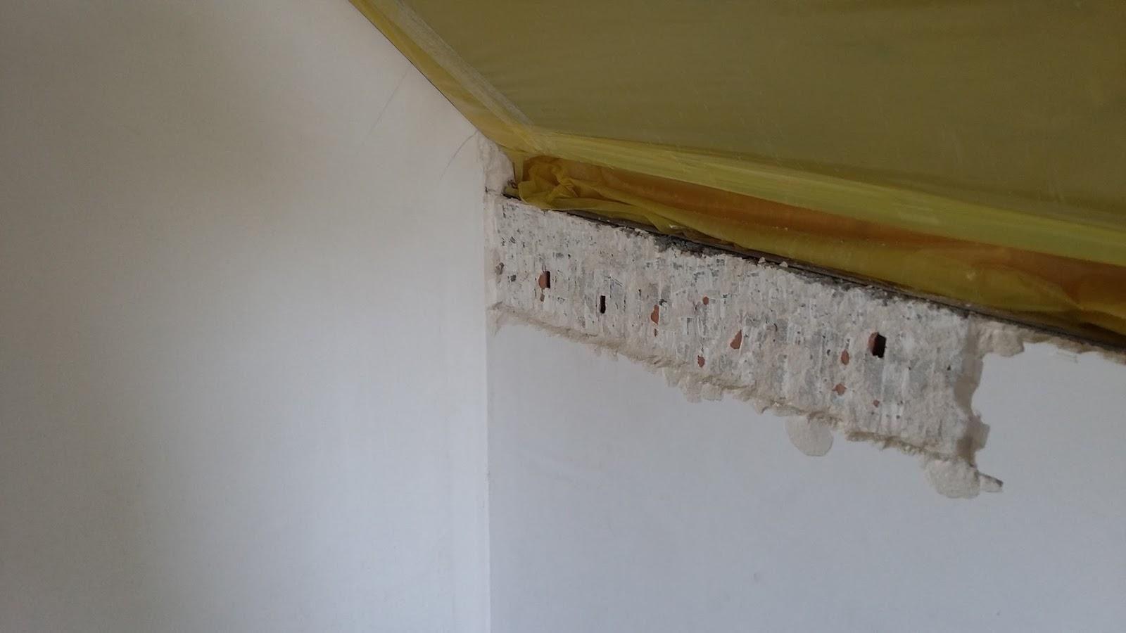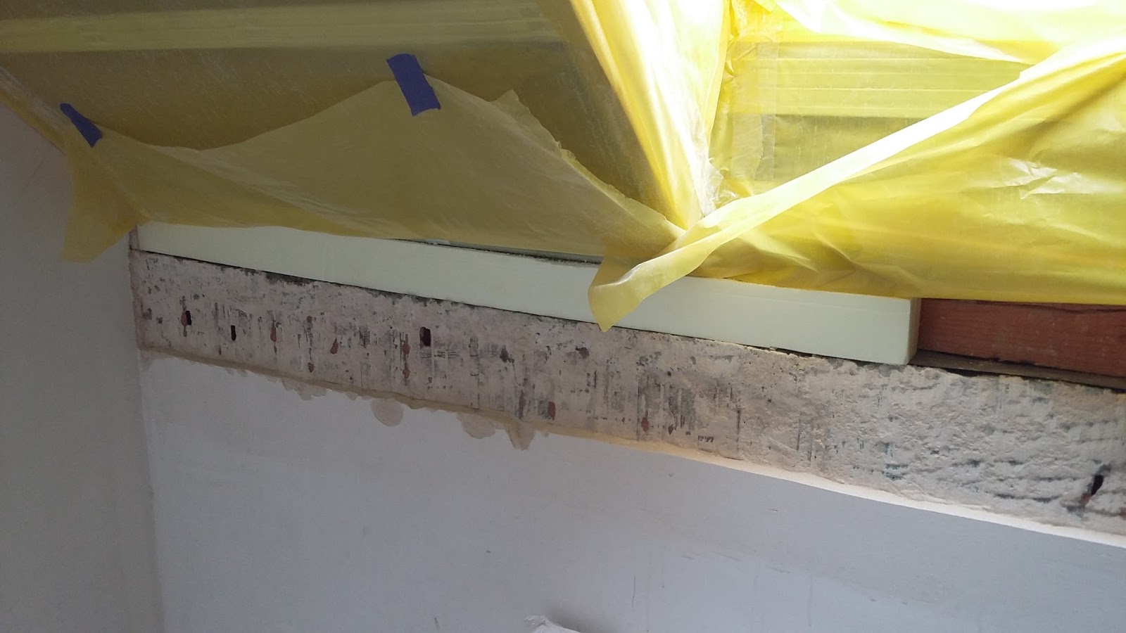 Pamiętacie kreskówkę puszczaną kiedyś dzieciom w TV pt. "Pomysłowy Dobromir"? Właśnie tak nagle coś mnie olśniło. Czy będzie to dobre rozwiązanie tego nie wiem, ale w tej chwili wydaje mi się jedynie słusznym (biorąc pod uwagę moje możliwości manualno-finansowe oczywiście). Kupiłem paczkę pięciocentymetrowego XPS (polistyrenu ekstrudowanego) używanego do ocieplania fundamentów wraz ze stosownym klejem w formie pianki pistoletowej. Z płyt XPSu wyciąłem paski szerokości potrzebnej do zakrycia murłaty (z jednej strony stanowi ocieplenie murłaty, z drugiej jest świetnym, bo bardzo twardym, podłożem pod płytę kartonowo-gipsową, o czym kilka zdań dalej. Folię ze skosu wcisnąłem pod pasek XPSa i połączyłem na klej z izolacją, na której leży murłata, tak więc kwestia ciągłości izolacji została rozwiązana. Jak teraz rozwiązać sprawę wykończenia ścianki kolankowej? Ścianka owa w moim domku jest wysoka (125 cm) i cała otynkowana, bez sensu jest więc wykonywanie dodatkowej konstrukcji z płyt k-g na profilach. Pomyślałem, że skuję do muru górny pas tynku ścianki kolankowej o wysokości 15 cm, co pozwoli na przyklejenie odpowiednio dociętej płyty k-g zakrywającej miejsce po skutym tynku ale też zafoliowany pas XPSa i, mam nadzieję, elegancko i skutecznie połączy ściankę kolankową ze skosem.