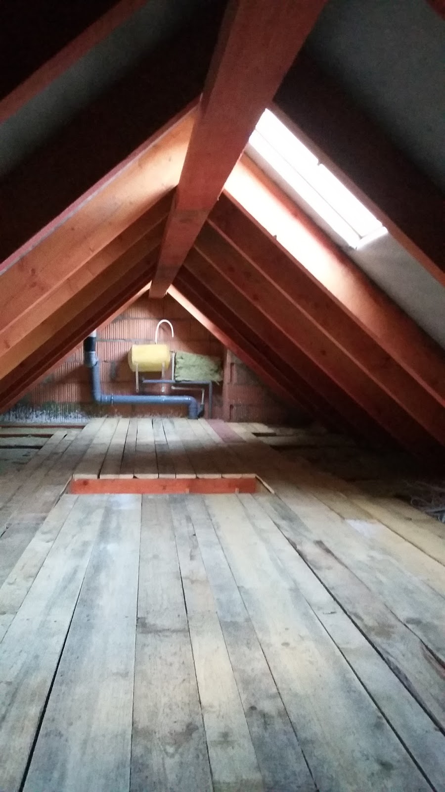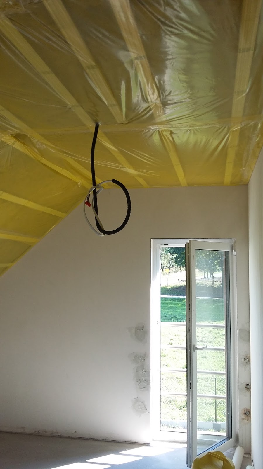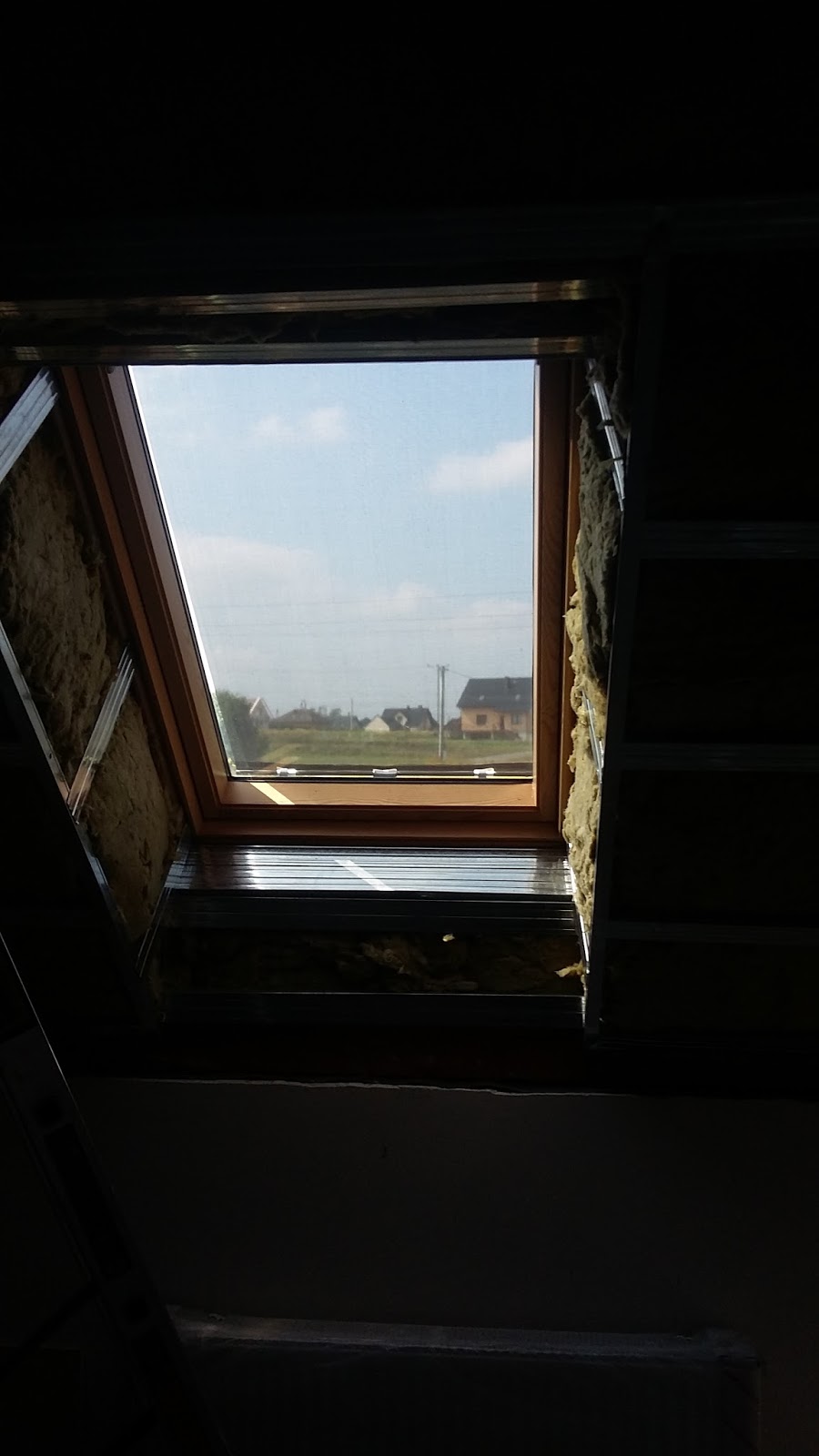 Większość czasu spędzam teraz na pięterku, no bo przed zimą trzeba w końcu ocieplić poddasze. Jeden pokój, łazienka i garderoba są już ofoliowane. Przy okazji wyszedł jednak pewien problem. Zabudowa skosu poddasza trafia mniej więcej w połowę wysokości murłaty i robi się taka "niezręczna" dziura między skosem i ścianką kolankową. Wszechwiedzący Internet jakoś w tej kwestii milczy (pewno źle go pytam :). Chodzę i myślę, myślę i dumam, dumam i kombinuję... może by tak... nie to beznadziejne rozwiązanie, a może by tak... nie to bez sensu, a może... chłopie, zlituj się !@#$%^& (to zapis wyrażenia, którego oficjalny Słownik Języka Polskiego nie przewiduje ;)