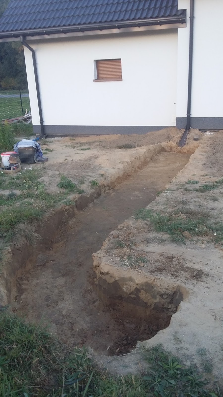 Trochę też dzisiaj powalczyliśmy w otoczeniu domku. Ponieważ urzędowy nakaz zobowiązuje nas do zagospodarowania wody opadowej na terenie własnej działki, poczyniliśmy pierwsze kroki do rozsączenia deszczówki w gruncie. W wykonanym na dwie łopaty i taczkę wykopie umieścimy kilkanaście metrów rury drenażowej owiniętej w geowłókninę i obsypanej żwirem. I tak będzie zrobione przy wszystkich pięciu rynnach. Mam nadzieję, że będzie to skuteczne rozwiązanie.