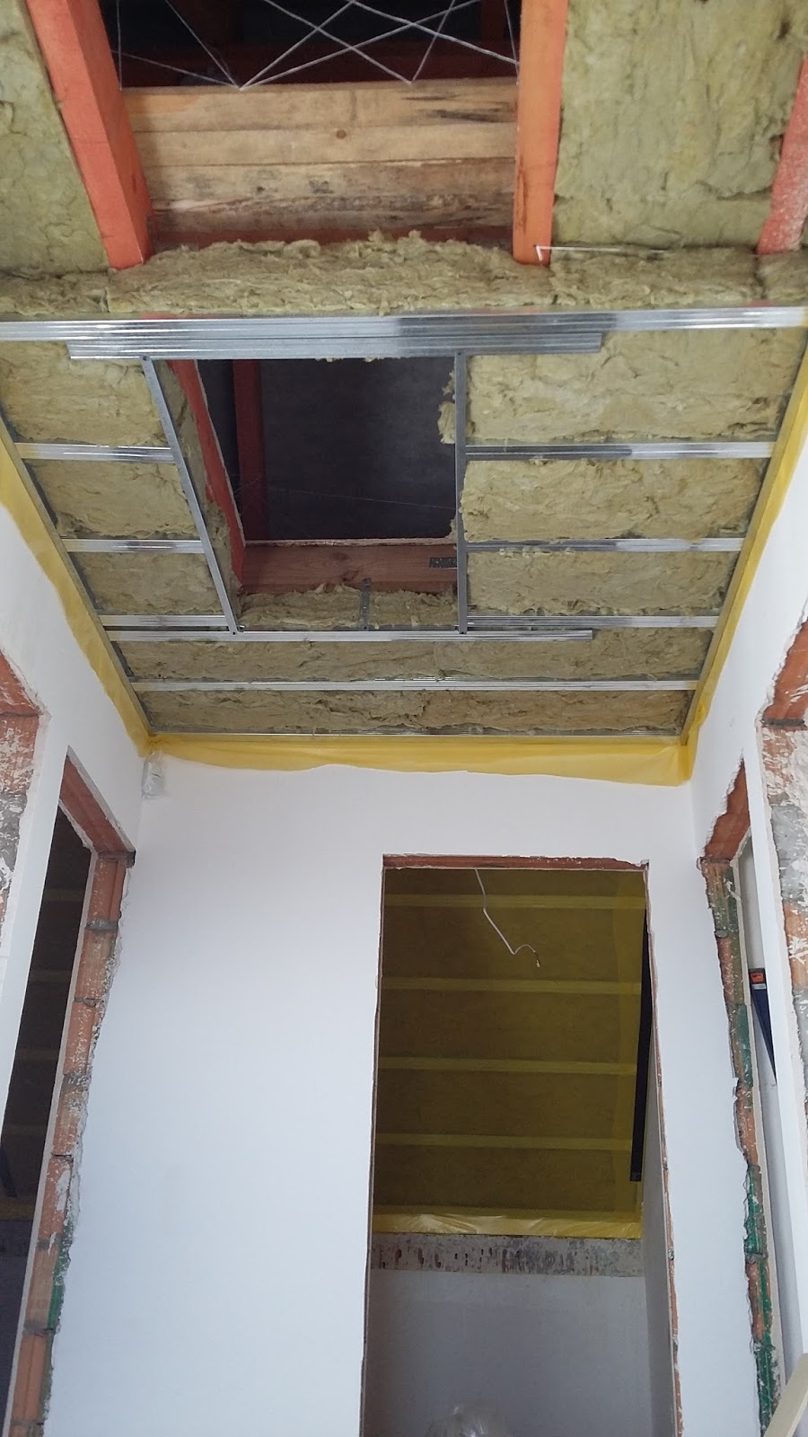 Przedwczoraj rozpocząłem też ocieplanie poddasza na klatce schodowej. Tyle ile mogłem zrobić stojąc na drabinie ustawionej na podłodze pięterka, tyle zrobiłem. Nie zapomniałem oczywiście o otworze na schody strychowe. Co jednak zrobić nad samymi schodami? Z drabiny, nawet tej wysokiej, nijak nie uda mi się walka z wełną mineralną i profilami, o płytowaniu i spoinowaniu nie wspomnę. Ratunkiem może być wyłącznie rusztowanie. Skąd tu jednak zdobyć takie ustrojstwo? Z pomocą przychodzi solidarność budujących swoje domy. Sąsiad znajomego od żony pożyczył nam 8 elementów rusztowania warszawskiego, które ustawione na klatce schodowej umożliwią mi po niedzieli wykonanie stosownych prac w tej części poddasza.
