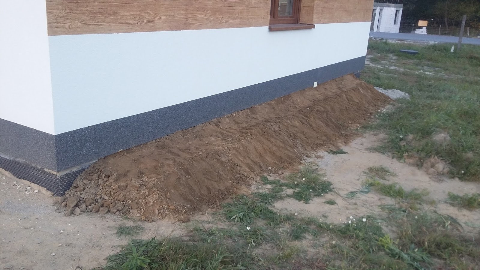 Nadmiar ziemi z wykopu posłużył do pierwszej niwelacji terenu, a konkretnie chodzi o podniesienie gruntu do wysokości cokołu, tak aby przykryć folię kubełkową. Widzę jednak, że jest to kropla w morzu potrzeb i bez kilkukrotnej wizyty załadowanej wywrotki chyba się nie obejdzie.