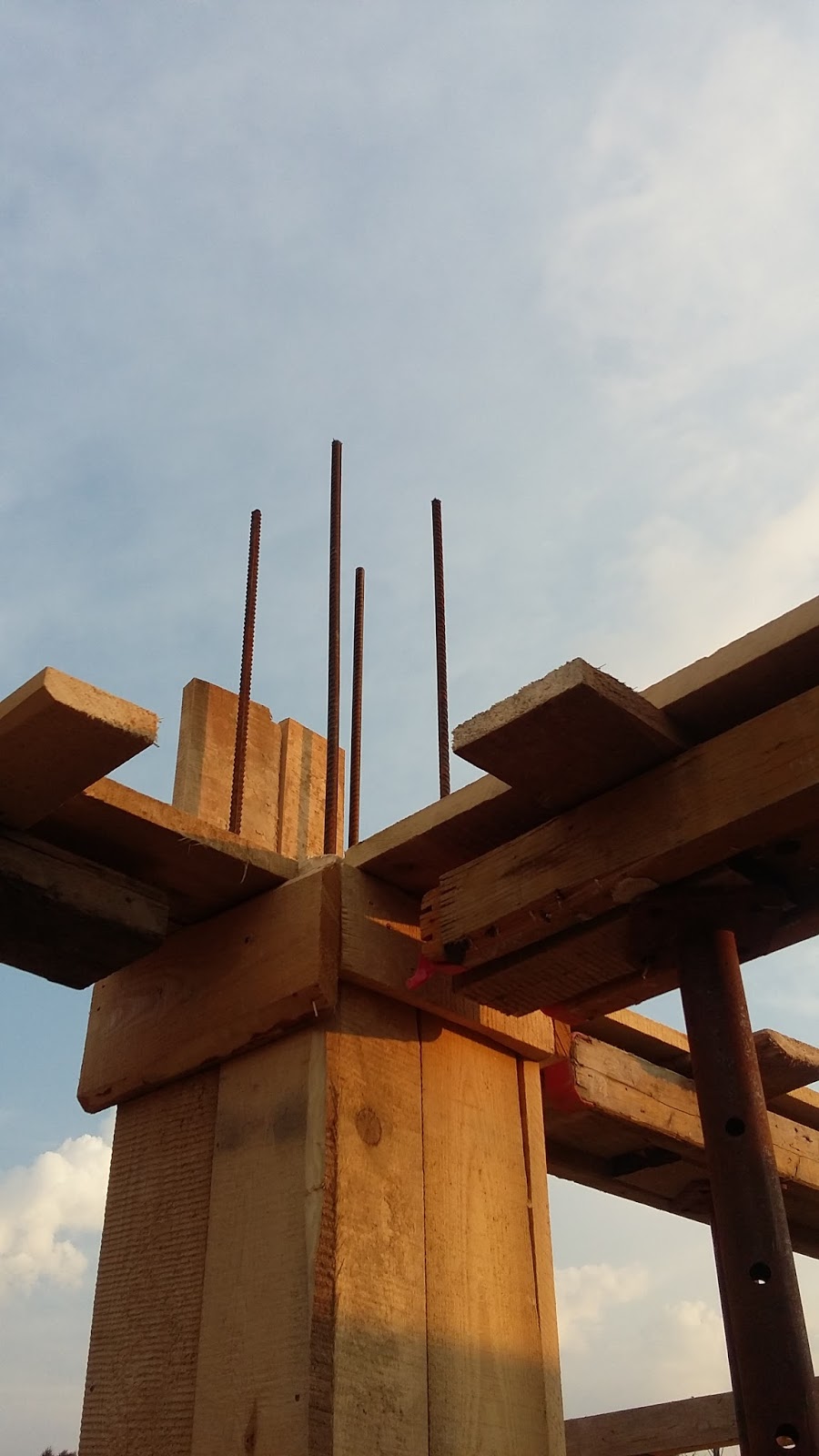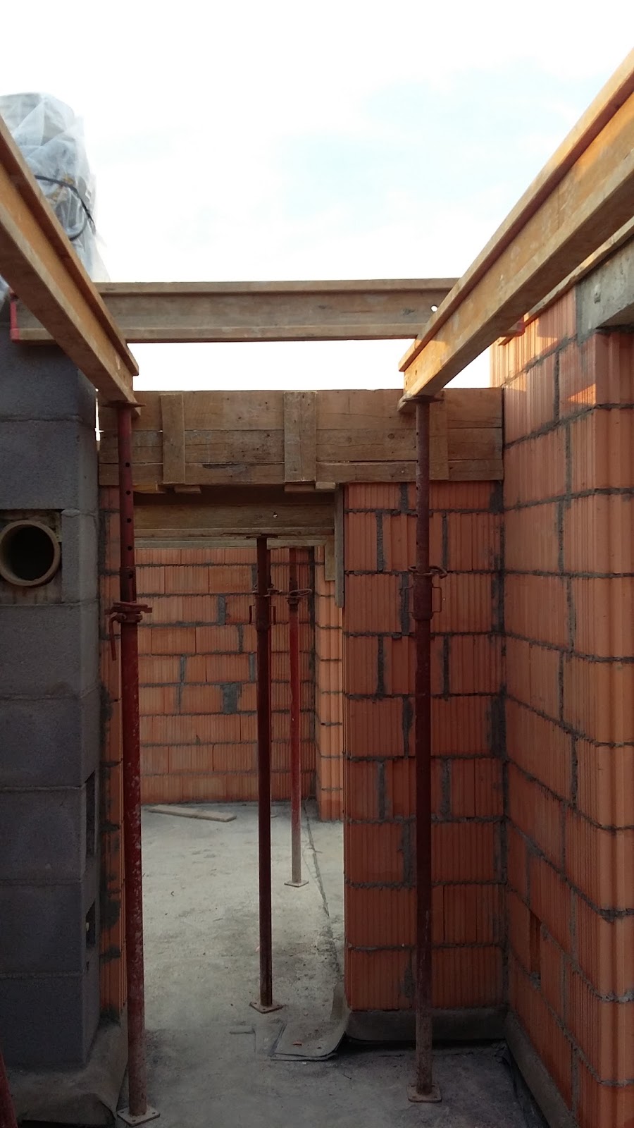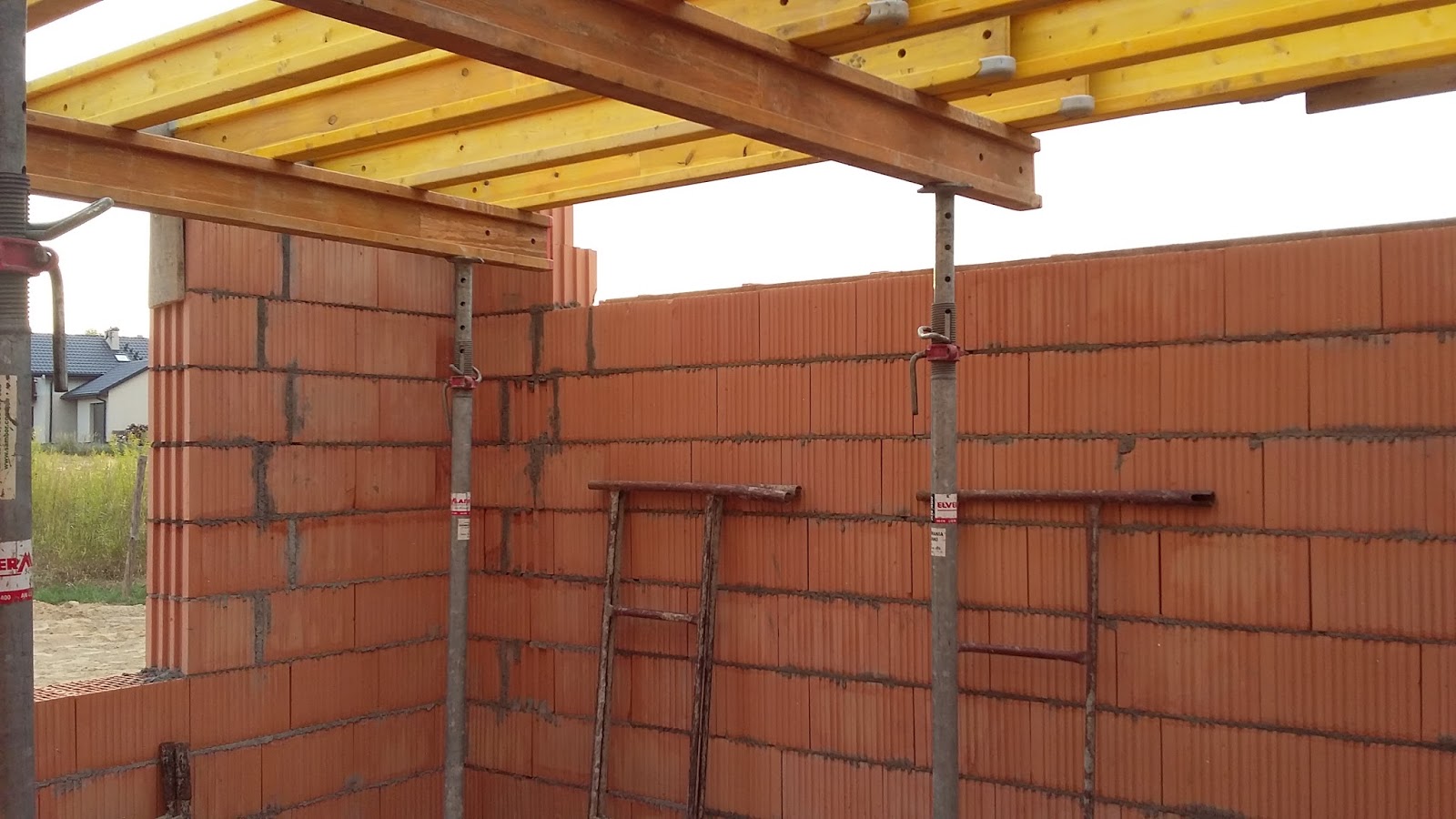 Termometr w cieniu pokazał dzisiaj 36 stopni Celsjusza, a w słońcu pewnie z 50 stopni. A na budowie walczą fachowcy przy konstruowaniu stropu. Pojawiły się wieńce i belki nośne, a także ułożono częściowo podpory pod deskowanie stropu. Zaszałowany został też słup wewnątrz salonu.