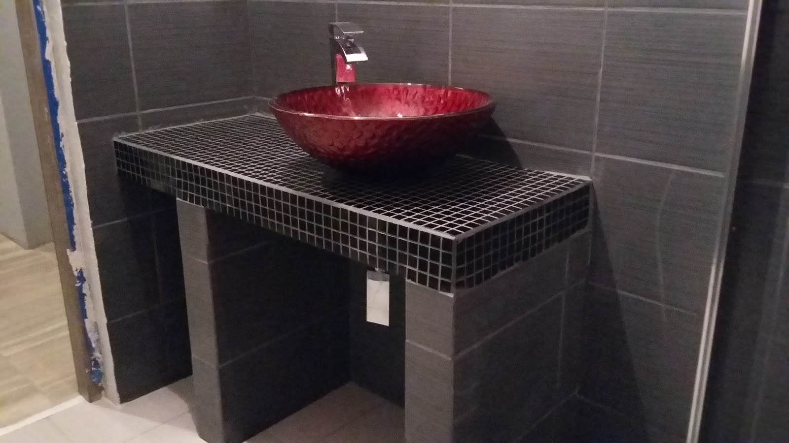 Do ukończenia prac w łazience zostały do złożenia ścianki kabiny prysznicowej i podłączenie umywalki do kanalizacji oraz baterii umywalkowej do wody ciepłej i zimnej.